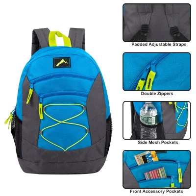 Buying High School Backpacks in bulk is the ultimate way to save money. School budgets are always thin so we’ve made it a point to offer high quality backpacks at affordable prices. Recommended for children grades 9th-12th. With its large design, this backpack is packed with cool features including stylish bungee cord detailing, adjustable and sturdy straps, two mesh side pocket for easily storing water bottles or gear, and two front pockets for added storage. Built from extra durable 600 denier polyester. 18″ x 13″ x 7″. Styles, colors and assortments may vary. Random color.