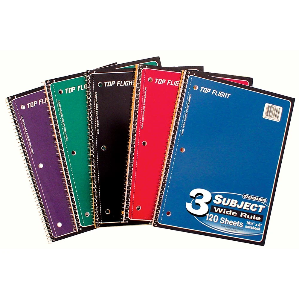 - Traditional 3-subject spiral notebooks w. wide-rule paper