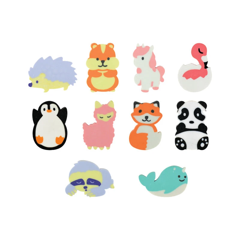 These Cute Animal Erasers have 10 adorable cartoon animal designs in the series: flamingo, llama, unicorn, hedgehog, sloth, hamster, fox, narwhal, penguin, and panda.