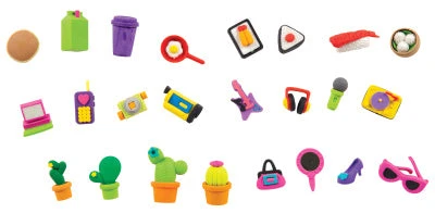 Our Eraser World Assortment Features A Huge Variety Of Mini Erasers Kids Love To Collect. The Entire Assortment of Erasers in Bulk Is Made Up Of Six Different Themes — Food Erasers like Sushi & Breakfast, Tech, Fashionista, Groovy Time, And Music — With Four Designs Per Theme. Each Detailed Eraser Is Made Up Of Smaller Pieces That Connect Together. You Get 288 Erasers In All, Individually Wrapped And Merchandised In A Tabletop Display.