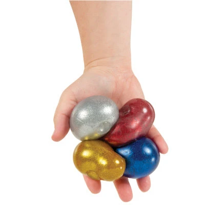 Out of this world squishable fun! Each translucent ball is filled with squishy metallic glitter. Colors include: galaxy gold, deep space blue, red planet red, and stardust silver.