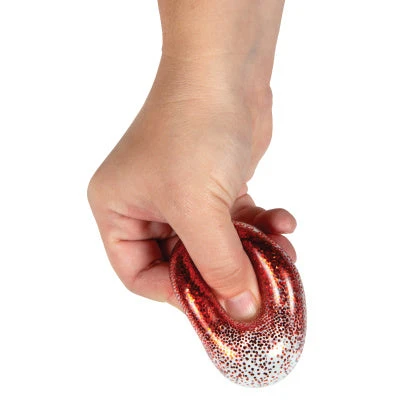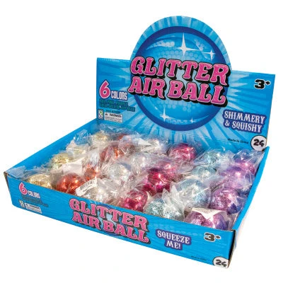 Hours of shimmery, squishy fun! Clear squishy air balls filled with sparkling glitter. 6 colors: red, silver, gold, magenta, purple, and blue. 2” in diameter.