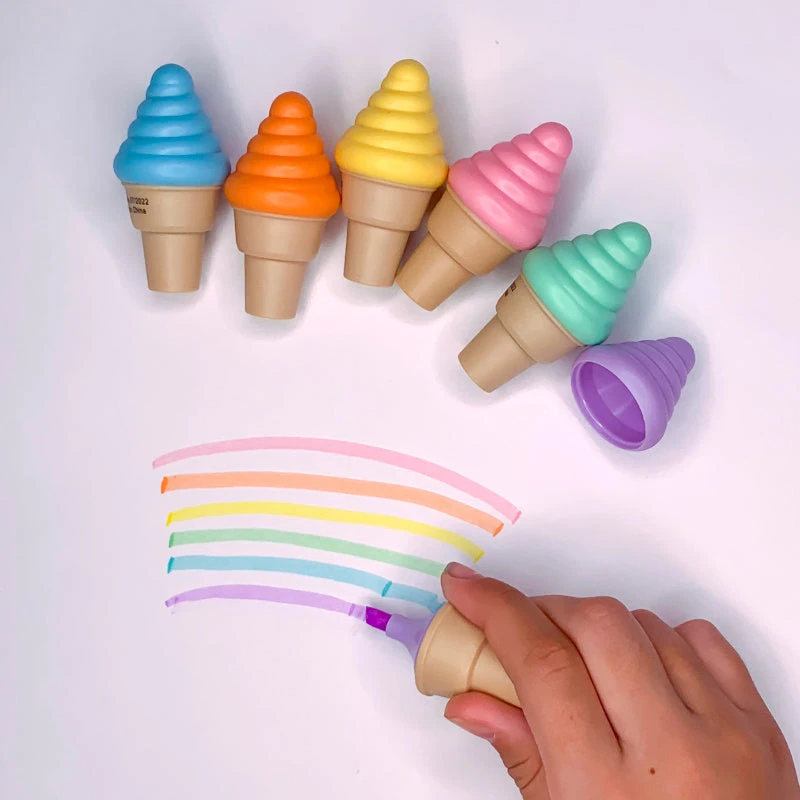 Highlighting just got cooler! These super cute, super cool highlighters are in the shape of an ice cream cone. Take off the ice cream top to highlight. Colors: pink, orange, yellow, green, blue, and purple. Highlighter ink matches ice cream color. Chisel tip.