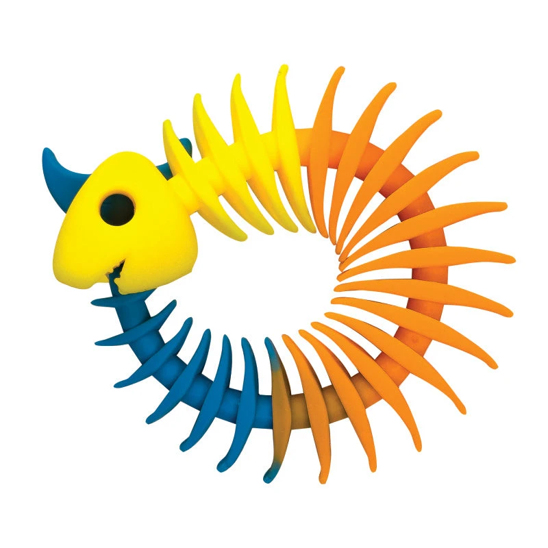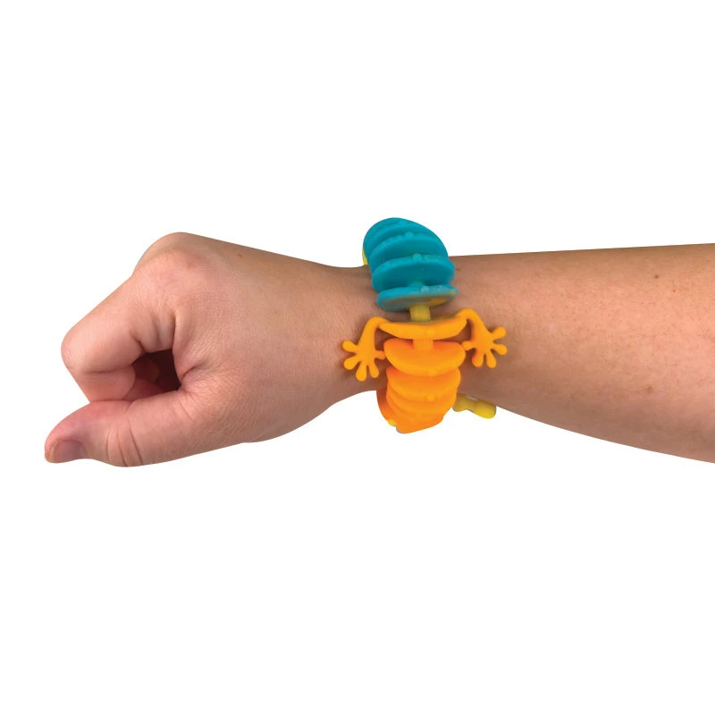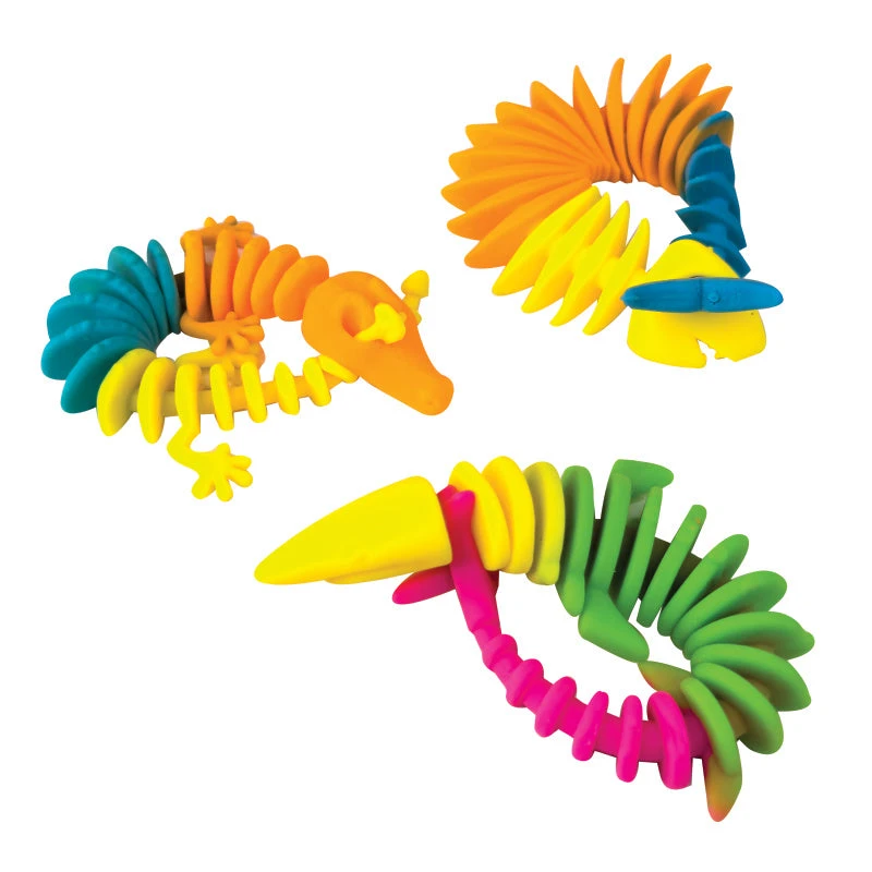 Stretchy sensory noodle toys in 3 skeleton shapes: alligator, shark and fish. Each toy is a multi-colored combination of yellow, blue, orange, pink, or citrus green. 8 3/4” – 10” long (depending on design). Link together to wear as a bracelet!