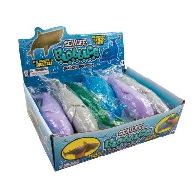 From the depths of the sea, come these fun to squish, fun to squeeze shark and dolphin toys! Each toy is filled with squishable orbs! Available in 4 colors: translucent blue dolphin, purple dolphin, translucent green shark, and grey shark.