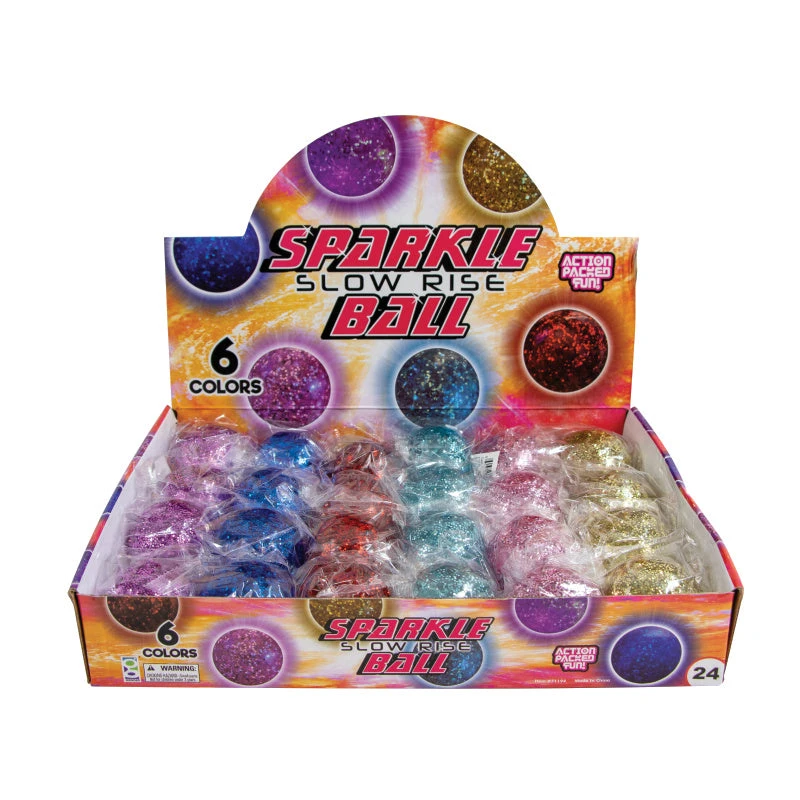 Shimmer, sparkle, squeeze! So much fun, you won’t be able to put these slow rise balls down! Each clear translucent ball is filled with sparkley glitter and squishable orbs. Colors include: pink, red, purple, gold, blue, and aqua. Approx 2″ in diameter.