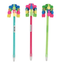 Bend, spin, write! Pen topper spins on top of pen, or can be removed to spin! Multi-colored topper sits on pink, green, or blue pen barrel. Black ink. Approx. 9” long. 12/Tub