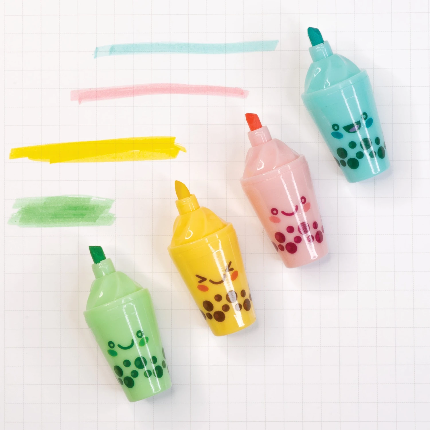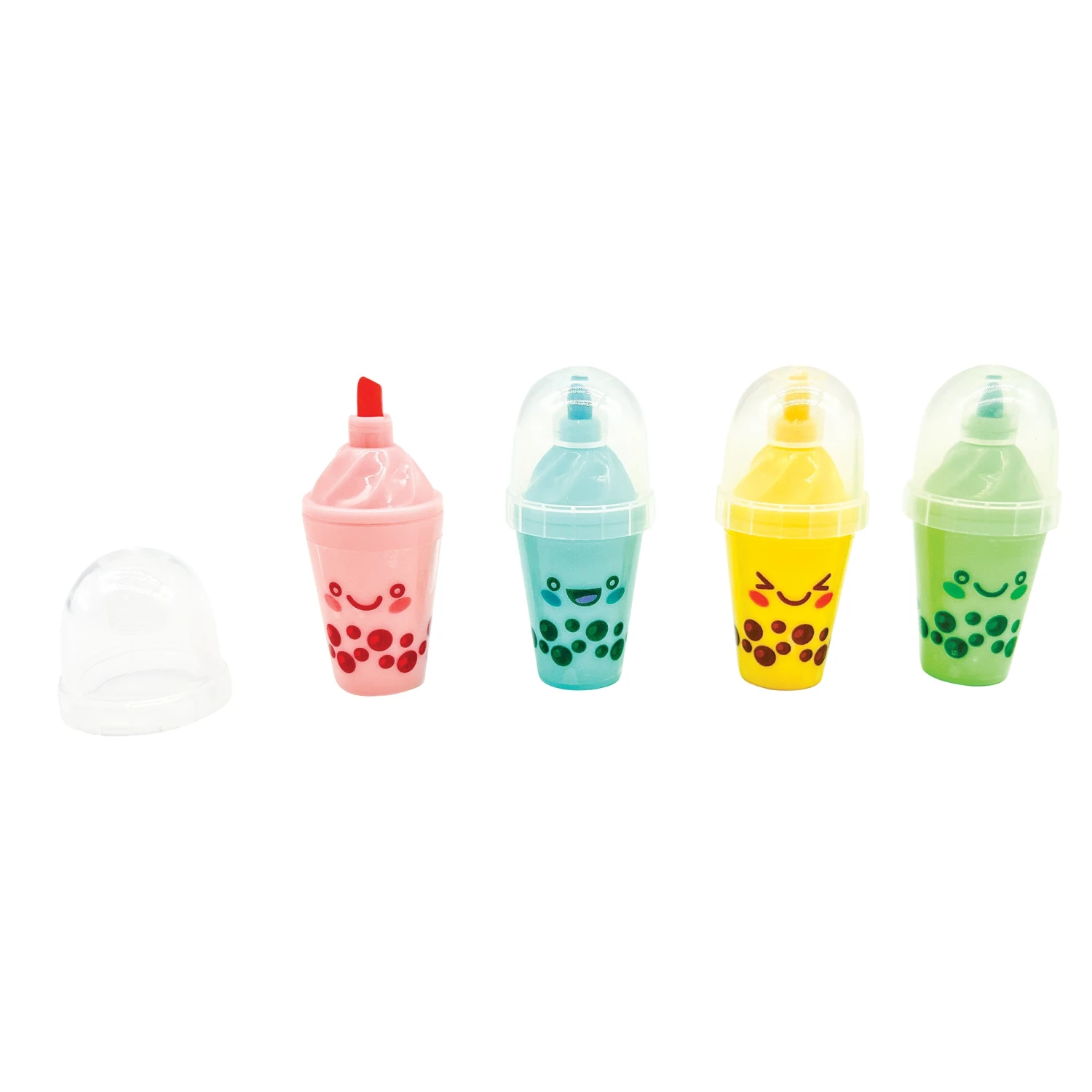 EXCLUSIVE! Un-unbeliev-boba-ly cute-tea highlighters! Remove boba tea top to reveal a chisel-tip highlighter. 4 colors: yellow, pink, blue and green.