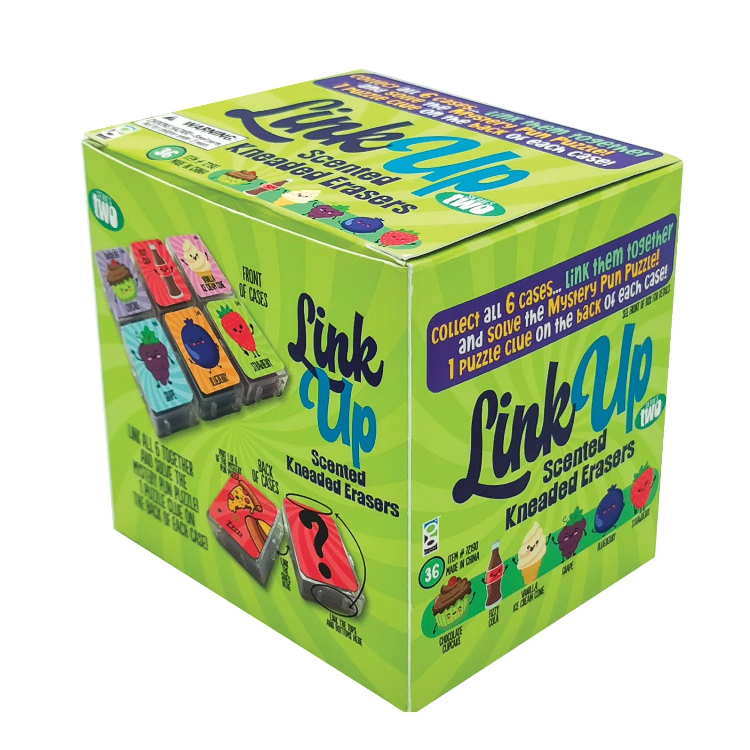 Collect all 6: Chocolate Cupcake, Fizzy Cola, Vanilla Ice Cream Cone, Grape, Blueberry, and Strawberry. Each kneaded eraser comes in a snap case to hold in scent. 1 puzzle clue on the back of each case.