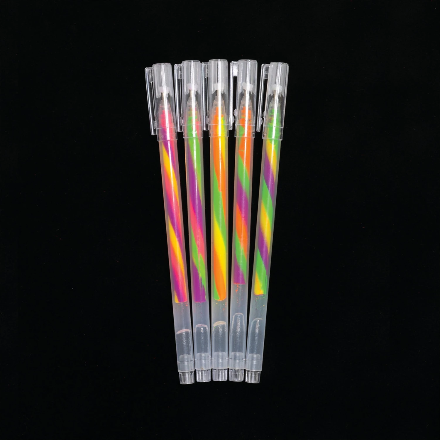 Spiraling, swirling colors in each pen! Assorted combinations of neon orange, purple, green, pink and yellow gel ink.