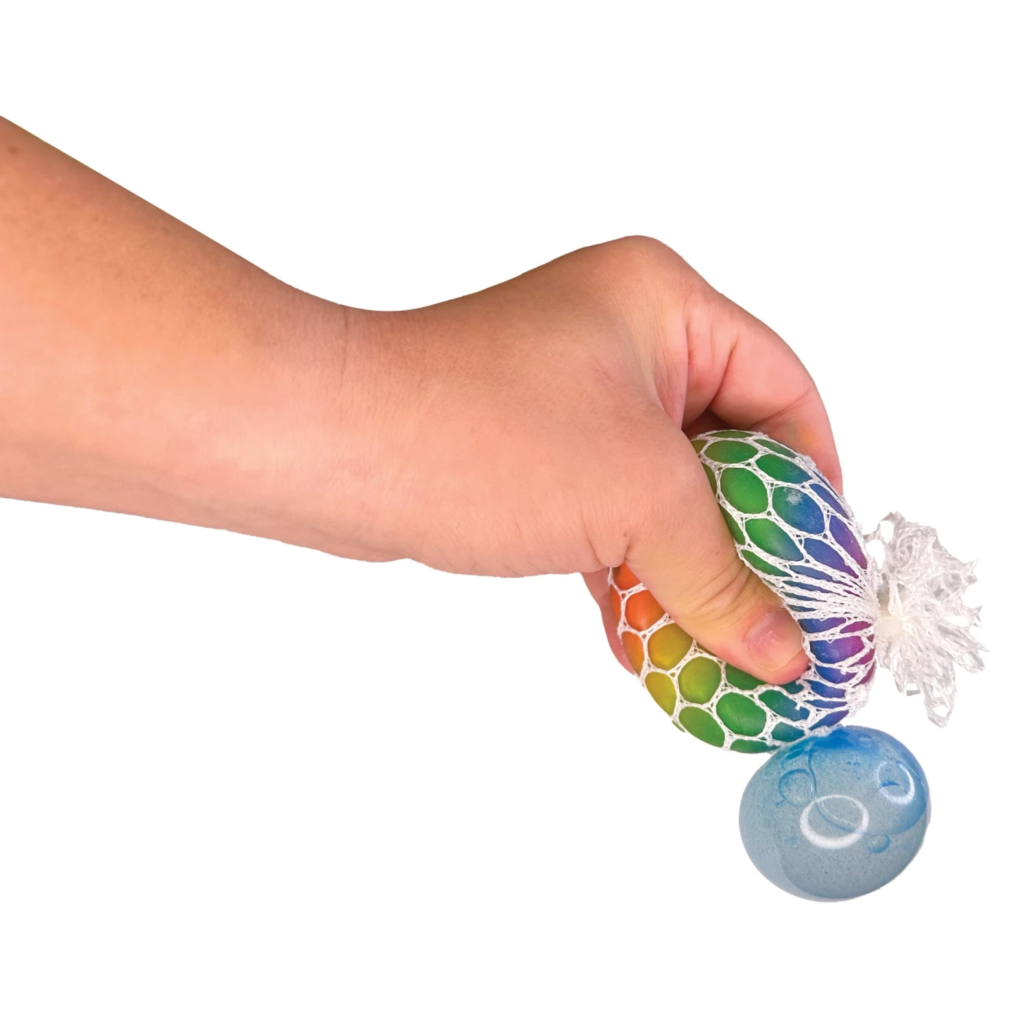 Make some noise! Rainbow mesh balls that go “splurt” when you give ‘em a squish and a squeeze. Great for relieving stress. White mesh fabric covers this rainbow colored ball.